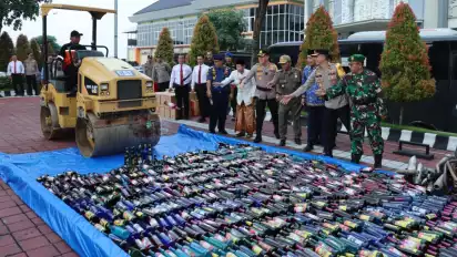 "Ribuan botol minuman keras (miras) kami musnahkan hari ini, terdiri dari 1238 botol anggur merah, 872 arak botol besar, 620 arak botol kecil dan 437 botol bir," tegas Kapolres Gresik.