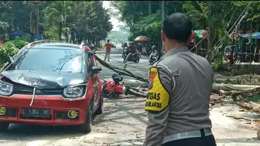 Dahan pohon Senggon Buto sepanjang 50 centimeter patah dan menimpa satu tiang listrik hingga roboh. Kabel listrik yang roboh itumenimpa satu mobil dan motor