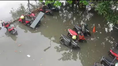 Tak hanya merendam jalan protokol, banjir juga merendam sebagian besar motor yang terparkir di salah satu halaman perkantoran di kawasan Jalan Mayjen Sungkono Surabaya.