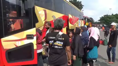 Sidoarjo, tvOnenews.com - Ratusan pemudik yang akan kembali ke tempat perantauannya, Jumat (28/4) diberangkatkan Kementerian Perhubungan RI dengan menggunakan tujuh armada bus, agar aman dan tak terjadi hal-hal yang tak dinginkan selama perjalanan. Petugas melakukan pengecekan terlebih dahulu, mulai dari armada bus hingga kelaikan jalan angkutan.