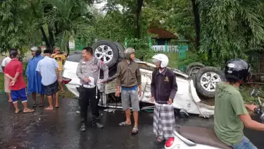 Petugas gabungan kini di lokasi masih tengah melakukan evakuasi mobil yang terguling, serta pembersihan material pecahan kaca dan tanah. (vaf/hen)