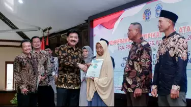 Lamongan, tvOnenews.com - Menteri Agraria Tata Ruang Badan Pertanahan Nasional (ATR/BPN) Hadi Cahyanto menyerahkan 154 sertifikat kepada warga Lamongan, Kamis (4/5) di gedung Lokatranta dan sejumlah kecamatan yang berada di kabupaten setempat.