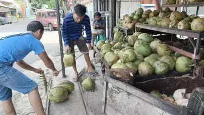 Probolinggo, tvOnenews.com - Omset pedagang kelapa muda (degan) naik pesat hingga dua sampai tiga kali lipat, seiring terjadinya cuaca panas ekstrem. Degan yang dijual di Pasar Gotong Royong Kota Probolinggo, laris manis.