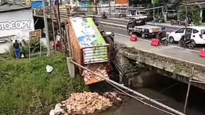 Malang, tvOnenews.com - Diduga sopir mengantuk, truk fuso muatan teh gelas 15 ton terguling setelah sebelumnya menabrak jembatan dan terperosok ke Sungai Kalisoerak, Lawang, Kabupaten Malang.