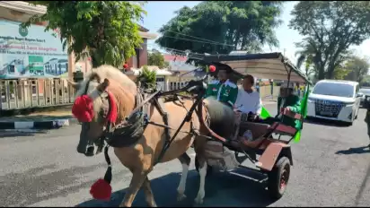 Didampingi Ketua Dewan Syariah DPC PPP, KH Bustomi Jauhari, Caleg PPP DPRD Propinsi Jatim Dapil IX, Dr Sakundoko dan sejumlah pengurus partai lainya, Anang Sulistyo yang juga telah dilantik sebagai Ketua DPC PPP Magetan ini mendaftar ke KPUD Magetan dengan naik delman.
