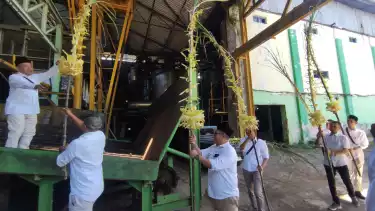 Kediri, tvOnenews.com - Mengawali musim giling, pabrik gula Meritjan Kota Kediri menggelar ritual pengantin tebu. Ritual tersebut sebagai bentuk doa selamat dan doa pengharapan, agar hasil gula pada musim giling tahun ini dapat melimpah, dan mampu memenuhi kebutuhan gula nasional, guna mewujudkan swasembada gula pada tahun 2028.