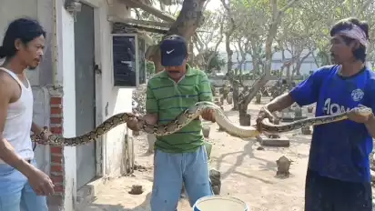 Dikira Kayu, Warga Wonoayu Sidoarjo, Tangkap Ular Sanca Bobot 8 Kg dan Panjang 3 Meter