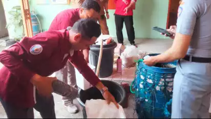 Untuk pupuk ikan kecil, bahannya empat botol gula tetes, dua botol probiotik EM4. Bahan-bahan itu kemudian dicampur dengan 120 liter air.