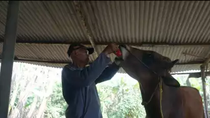 "Saya tangani sendiri, saya suntik Biodin, lalu saya kasih telur dan minuman teh pucuk. Jika benjolan di tubuh sapi sudah meletus itu berarti sembuh. Kalau belum meletus masih kesakitan sapinya," ucap Mustofa saat ditemui di kandangnya, Kamis.