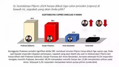 Pada simulasi 3 nama, elektabilitas Prabowo Subianto semakin tinggi yakni di angka 43,5%. Lalu Ganjar Pranowo di angka 38,5% dan Anies Baswedan 12,8%. Sebanyak 5,2% responden menyatakan belum memilih.