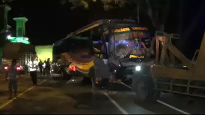 Ngawi, tvOnenews.com - Diduga sopir ugal-ugalan, Bus Sugeng Rahayu nopol W 7079 UZ menabrak truk tronton AG 8842 EB di jalur Ring Road Ngawi, Desa Beran Kecamatan/ Kabupaten Ngawi, Jumat (9/6) sekitar pukul 3.30 WIB.