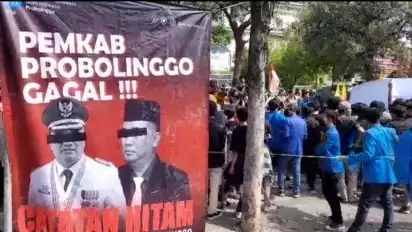 Probolinggo, tvOnenews.com - Ratusan mahasiswa yang tergabung dalam Pergerakan Mahasiswa Islam Indonensia (PMII) Kabupaten Probolinggo, menggelar aksi unjuk rasa di depan Kantor Pemerintah Daerah (Pemkab) Probolinggo di Jalan Panglima Sudirman, Kota Kraksaan Probolinggo, pada Kamis (15/6).