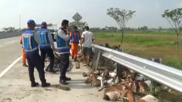 Karena kecepatan 90 kilometer per jam, mobil pun melaju tak terkendali hingga terguling dan seluruh muatan kambing termasuk 3 orang penumpang juga tumpah berhamburan di jalan tol.