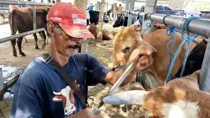 Tulungagung, tvOnenews.com - Menjelang Hari Raya Idul Adha, jasa salon perawatan hewan kurban di Pasar Hewan Terpadu di Tulungagung, kebanjiran orderan. Para pedagang sapi, memilih menggunakan jasa perawatan hewan kurban untuk membersihkan kuku dan memperbaiki bentuk tanduk.