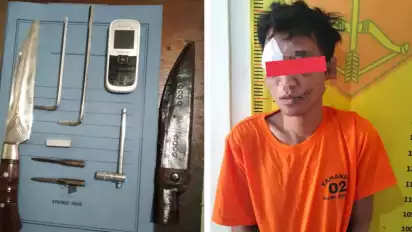 "Disertai membawa senjata tajam jenis pisau dengan sarung kulit warna coklat dengan panjang beserta gagangnya sekitar 35 cm. Yang berhasil diamankan oleh saksi beserta warga dan anggota Sat Reskrim Polsek Kebomas dan Polres Gresik," ujarnya.