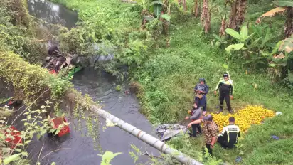Malang, tvOnenews.com - Sebuah kendaraan pick up bermuatan buah jeruk seberat 6 kuintal terjebur ke dalam sungai, di Desa Sukosari, Kecamatan Gondanglegi, Kabupaten Malang.
