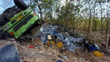 Truk Muat Ikan 18 Ton Terbalik di Jalur Hutan Pantura, Ratusan Ikan Tumpah di Jalan