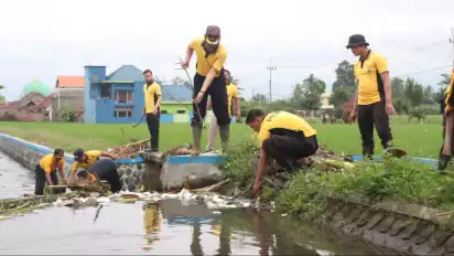 Malang, tvOnenews.com - Kepolisian Resor Malang, Polda Jatim, melakukan aksi peduli lingkungan dengan membersihkan saluran air dan bantaran sungai yang tersumbat sampah. Gotong royong dilakukan bersama sejumlah elemen masyarakat di sejumlah wilayah Kabupaten Malang, Kamis (13/7).