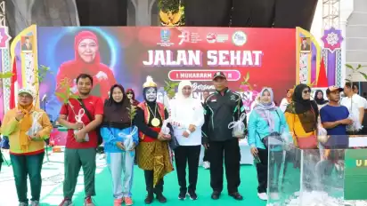 Gubernur Khofifah Bagikan 1445 Bibit Pohon Gratis dalam Jalan Sehat 1 Muharram 1445 H di Masjid Al-Akbar Surabaya