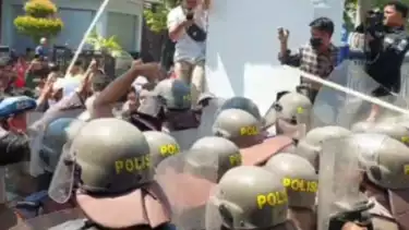 Pantauan di lapangan, selain terlibat saling dorong dengan polisi, mereka juga melempar sejumlah potongan kayu, potongan bambu yang dipakai sepanduk dan baliho kepada petugas kepolisian.