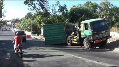 Magetan, tvOnenews.com - Gara-gara as roda patah saat melaju di jalan tanjakan di Jalan Samudra, Kelurahan Bulukerto, Magetan, truk kontainer muatan kulit nopol L 9811 UR melaju mundur dan menabrak pagar rumah warga, sebelum akhirnya kontainer terlepas dan terguling di jalan, Rabu (16/8).