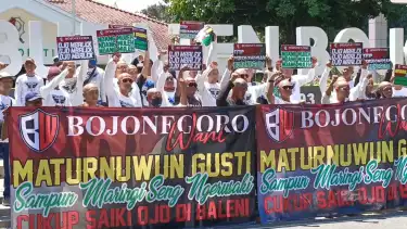 Terbentang spanduk protes bertuliskan 'Bojonegoro Wani, Matur Suwun Gusti, Sampun Maringi Seng Ngrusaki, Cukup Sak Iki Ojo Dibaleni' yang artinya Bojonegoro wani, terima kasih Tuhan telah memberikan (pemimpin) yang merusak, cukup saat ini jangan diulang kembali.