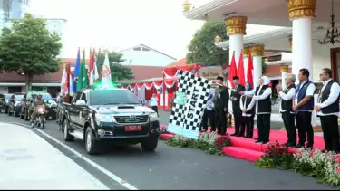 Surabaya, tvOnenews.com - Gubernur Jawa Timur Khofifah Indar Parawansa memberangkatkan Kirab Pataka Jer Basuki Mawa Beya sebagai rangkaian dimulainya HUT Pemprov Jatim ke-78 di Gedung Negara Grahadi.