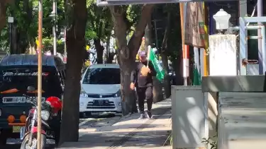 Meski di bawah terik mentari pagi, Dedy bersemangat jalan kaki sembari membawa bendera Nahdlatul Ulama.Â