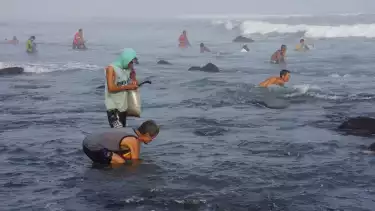 “Ini sudah seminggu muncul kerangnya, tapi masih kecil-kecil. Kita nyarinya saat ombak laut mulai surut, biasanya mulai jam 3 sampai jam 5 sore,” kata Husen kepada tvOnenews.com, Senin (16/10).