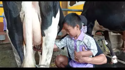 Usai diberikan informasi dan pengetahuan tentang seekor sapi, para siswa didampingi dengan para peternak di kandang sapi, belajar memerah susu sapi. Sebagian siswa semangat untuk mendapatkan susu sapi dari induknya, namun tak sedikit pula siswa paud yang harus diberikan pengertian ekstra agar mau untuk praktik memerah sapi.