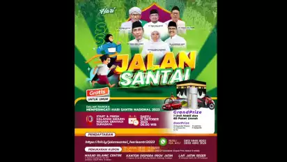 "Ada kuota peserta sebanyak 100.000 orang untuk mengikuti Jalan Santai memperingati Hari Santri Nasional besok Sabtu 22 Oktober 2023. Mari warga Jawa Timur ikut mendaftar dan turut meramaikan kegiatan tersebut," kata Gubernur Khofifah, Jumat (20/10).