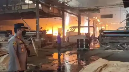 Sementara itu, pantauan tvOnenews.com di lokasi, terlihat kepulan asap hitam membumbung tinggi dari bagian ruang belakang pabrik yang merembet ke tempat penampungan produk jadi. Bahkan, akibat hembusan angina kencang, api terus semakin berkobar dan menyebabkan atap dan dinding bagian belakang pabrik roboh.