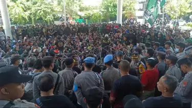 Surabaya, tvOnenews.com - Buntut kekalahan beruntun yang dialami oleh Persebaya Surabaya dalam laga lanjutan liga 1, ratusan suporter Tim Sepakbola Persebaya Surabaya menggelar aksi menuntut janji Manajemen Persebaya, di Kantor Manajemen Persebaya, Jalan Hayam Wuruk, Surabaya, Senin (30/10).