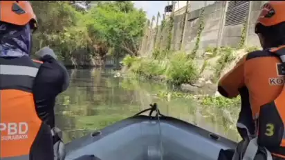 Menindak-lanjuti laporan masyarakat ini, sejumlah petugas BPBD Kota Surabaya melakukan penyisiran di sungai dengan menggunakan perahu karet.