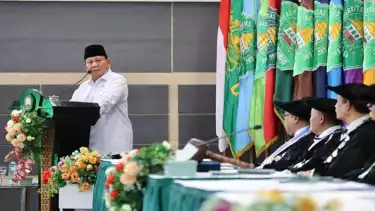 Malang, tvOnenewws.com — Menteri Pertahanan Prabowo Subianto hadiri acara pengukuhan Guru Besar Kehormatan Prof HC Dr. H. Ali Masykur Musa yang dihelat di Universitas Islam Malang (UNISMA), Malang, Jawa Timur, Sabtu (18/11).