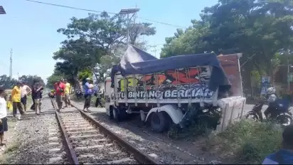 “Diduga tidak mengetahui adanya kereta api yang sedang melintas, truk tanpa muatan yang melaju dari arah utara dan hendak masuk ke Jalur Pantura ini langsung disasak hingga ringsek di sebuah perlintasan tanpa palang pintu," jelasnya.