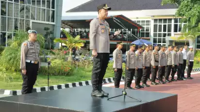 Adhitya Panji Kapolres Gresik mengingatkan kepada masyarakat yang akan berlibur saat Natal dan Tahun Baru 2024 untuk tetap menjaga keselamatan saat apel di Mapolres Gresik, Rabu (27/12).