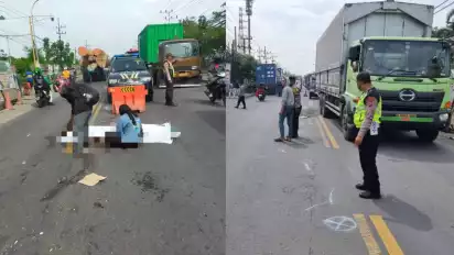 Gresik, tvOnenews.com - Gara-gara motor yang ditumpanginya membentur bodi samping truk tronton saat anaknya mencoba mendahului kendaraan di depannya, seorang guru asal Kecamatan Ujungpangkah, Kabupaten Gresik tewas terlindas roda truk saat melintas di Raya Sukomulyo, Manyar.