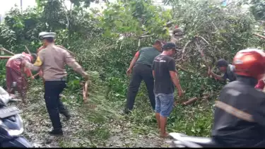 Mereka melakukan gotong royong mulai dari meminggirkan batang pohon, bersihkan ranting hingga turut mengatur kepadatan lalu lintas.