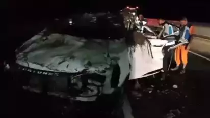 Mobil Fortuner tersebut ringsek dan nyaris tak berbentuk setelah terguling dan menabrak pembatas jalan tol hingga akhirnya terbalik di parit tepi jalan tol.