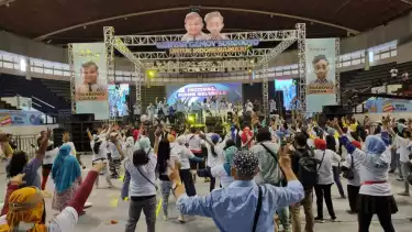 Surabaya, tvOnenews.com - Sinergi menang satu putaran, Komunitas Teknokrat Sinergi untuk Indonesia Maju (KOM’ITS 08) mengadakan Gebyar Gemoy Surabaya di DBL Arena, Jalan Ahmad Yani Surabaya, Minggu (28/1). Ada konser musik menghadirkan Power Metal, bazaar UMKM dan pasar sembako murah.
