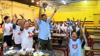 Salah satunya terpantau di nobar yang dilaksanakan emak-emak UMKM Tanjung Perak. Setelah suara pasangan calon (paslon) nomor 2 ini mencapai angka 58 persen mereka langsung berjoget dan berteriak, bahkan bernyanyi merayakan kemenangan dari hitung cepat ini.
