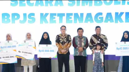 Selain santunan dari Pemprov Jatim, Pj. Gubernur Adhy menerangkan bahwa petugas yang meninggal dunia juga mendapatkan santunan dari BPJS Ketenagakerjaan. Dalam Rakortekrenbang ini juga diserahkan santunan BPJS sejumlah Rp42 juta kepada masing- masing 10 orang petugas Bawaslu, KPU, dan pekerja rentan oleh Dirut BPJS Ketenagakerjaan Anggoro Eko Cahyono didampingi Sekjen Kemendagri Suhajar Diantoro dan Pj. Gubernur Adhy. (hen)