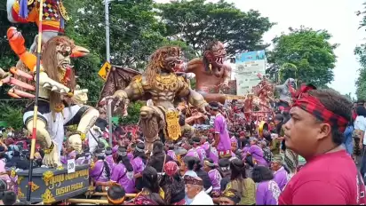 Blitar, tvOnenews.com - Ribuan umat Hindu menggelar pawai ogoh-ogoh di Jalan Bromo, Kecamatan Wlingi, Kabupaten Blitar. Umat membawa berbagai atribut keagamaan dan berbagai patung raksasa berbagai jenis pawai, bertujuan untuk mensucikan lingkungan dari segala unsur negatif.