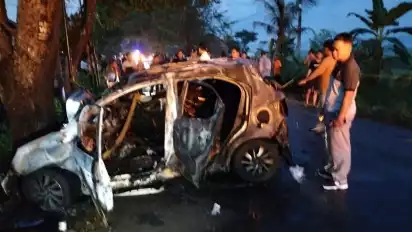 “Sempat oleng, tau-tau menumbur pohon dan mobilnya terbakar sempat juga ada suara teriakan minta tolong, dari penumpang atau pengemudi, namun warga enggan mendekat karena mobil terbakar,” terang Nanang.