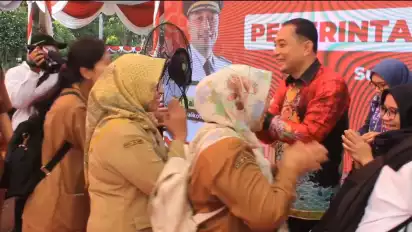 Surabaya, tvOnenews.com - Hari pertama masuk kerja usai libur dan cuti bersama lebaran, Wali Kota Surabaya Eri Cahyadi bersama Wakil Wali Kota Surabaya Armuji, menggelar halal bi halal bersama 7000 ASN di lingkungan Pemkot Surabaya, Selasa (16/3/2024), di halaman Balai Kota Surabaya.