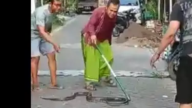 Ular yang bersembunyi di dalam pagar salah satu warga itu, akhirnya berhasil diamankan, setelah kepala ular piton tersebut tersangkut dicelah gorong gorong. Usai berhasil ditarik beramai-ramai ke tengah jalan, warga kemudian menangkap ular tersebut dan memasukkannya ke dalam karung.