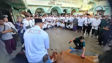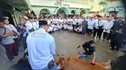 Surabaya, tvOnenews.com - Menjelang hari raya Idul Adha, Juru Sembelih Halal (Juleha) mengajarkan cara menyembelih hewan kurban secara syar’i kepada puluhan warga di Surabaya. Menariknya, dalam pelatihan ini warga diajarkan langsung menggunakan sapi hidup yang hendak disembelih. Diharapkan, saat hari raya Idul Adha nanti, warga bisa melakukan penyembelihan hewan kurban secara mandiri.