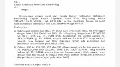 Surat yang dikeluarkan BPN Banyuwangi yang ditujukan kepada Kapolresta Banyuwangi, Kombes Pol Nanang Haryono ini bernomor 992/600.1.35.10/VII/2024, tertanggal 1 Juli 2024.