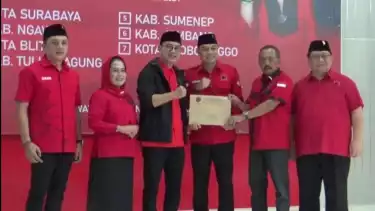 Surabaya, tvOnenews.com – PDI Perjuangan Jawa Timur menyerahkan surat rekomendasi dukungan kepada tujuh pasangan bakal calon kepala daerah (bacakada) kabupaten/kota. Surat rekomendasi ini termasuk untuk pasangan petahana Eri Cahyadi–Armuji, yang maju lagi di Pilkada Kota Surabaya.